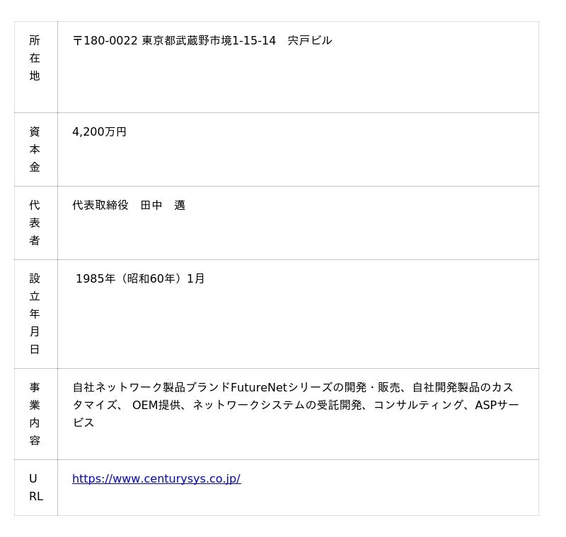 センチュリー・システムズは、エンタープライズから組み込み、IoT/M2Mシステム開発等ネットワーク分野を中心に、ハードとソフトの開発を行う開発会社です。FutureNet(R)ブランドでの自社製品の提供を中心として、製品のカスタマイズや新規開発を含む受託開発、OEM 提供、ASP・クラウドサービス (WarpLink(R))の提供をしています。受託開発では M2M、センサネットワーク、遠隔監視制御、高信頼ネットワーク、専用ゲートウェイ等の装置/システム開発や通信プロトコルのライセンス提供等で幅広い実績を持っています。
