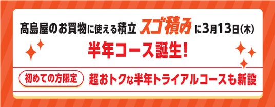 「高島屋のスゴイ積立」のことで、高島屋のお買物にお使いいただける積み立てサービスです。これまでは、「高島屋ネオバンク」アプリ内で、毎月一定額を12ヵ月積み立てると1ヵ月分のボーナスをプラスした「お買物残高」がアプリにチャージされ、積み立ての満期後は、国内の高島屋や高島屋オンラインストア、タカシマヤファッションスクエアのお買物にご利用いただけるサービスとしてご好評いただいておりました。3月13日から新コースを導入することで、半年間の積み立てでお買物にご利用いただくことが可能となります。