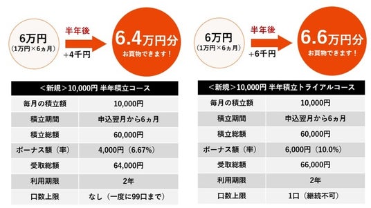 そしてこの度、積立サービス「スゴ積み」において、【10,000円半年コース】と、これまで「スゴ積み」の契約申し込みをしたことがない方を対象としたボーナス付与率の高い【10,000円半年トライアルコース】を導入することといたしました。
