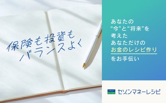 保険の見直しや投資へのチャレンジ… お金の悩みや資産形成の方法はひとそれぞれ。 だからこそ、 あなたの"今"と"将来"を考えた、 あなたにあったお金の貯め方・増やし方のレシピ(調理方法)が大切です。 保険も投資もバランスよく。 「セゾンマネーレシピ」は、 資産形成の第一歩を踏み出すあなたに 役立つ情報をお届けする保険・投資情報サイトです。