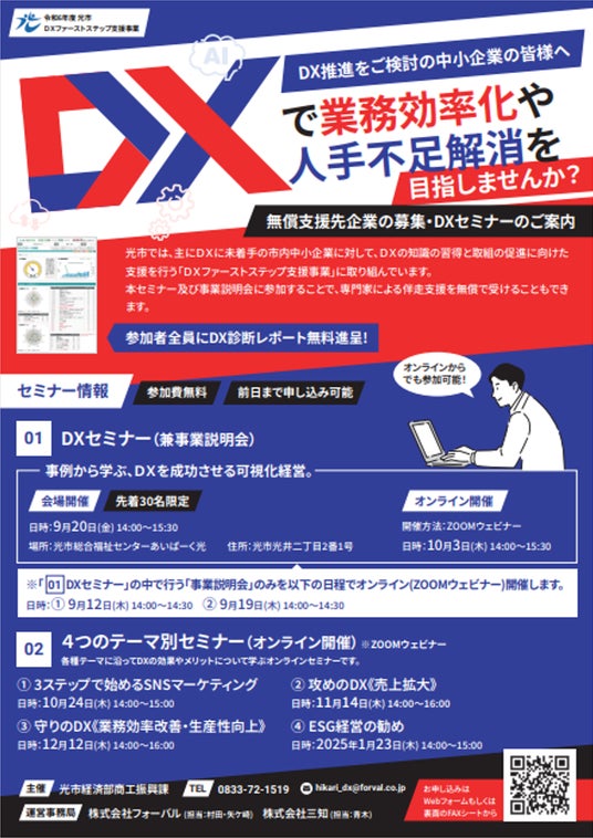 本事業でフォーバルは、フォーバルの子会社であり光市内で事業展開をしている株式会社三知(本社:山口県光市、代表取締役社長:古川 雅之、以下「三知」)と連携し、主にDXに未着手の市内中小企業を対象に、DXの知識習得と取り組みの促進に向けた支援を通じて、産業におけるDXのモデルケースを創出し、その成果を市内事業者に波及させることで、デジタル変革を促進し、地域商工業の育成を目指します。