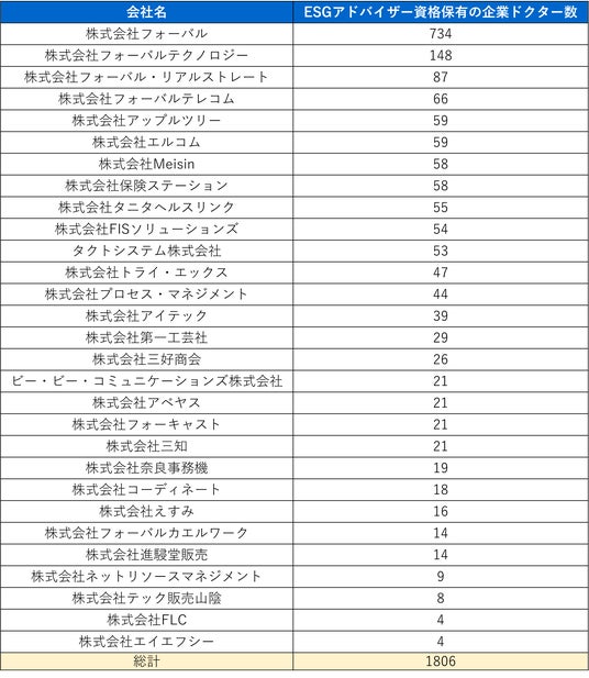 【株式会社フォーバルグループ29社のESGアドバイザー資格保有の企業ドクター数の人数内訳】