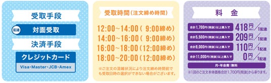 受け取り時間を指定できるため、仕事や育児、介護や天候の悪い日など、店舗に立ち寄ることや時間がないときにも簡単で便利なサービスです。月会費・年会費も無いため、サービス登録いただくことでいつでも気軽に利用できます。