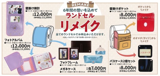 さらに今年より初めて、愛着のあるランドセルをフォトアルバムやメガネケースに生まれ変わらせる「ランドセルリメイク」の受付を開始いたします。ご本人はもちろんのこと、ランドセルを買ってもらったおじいさま、おばあさまやご両親への贈り物としても最適です。