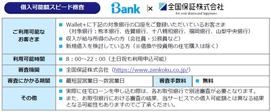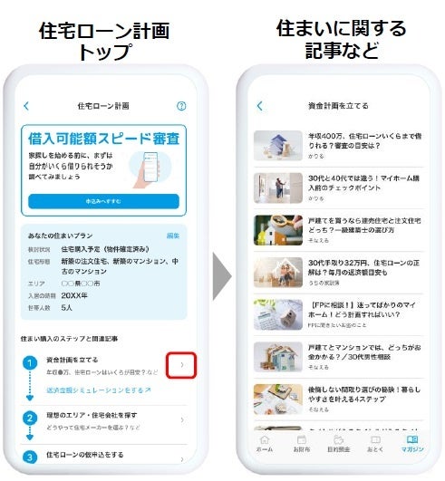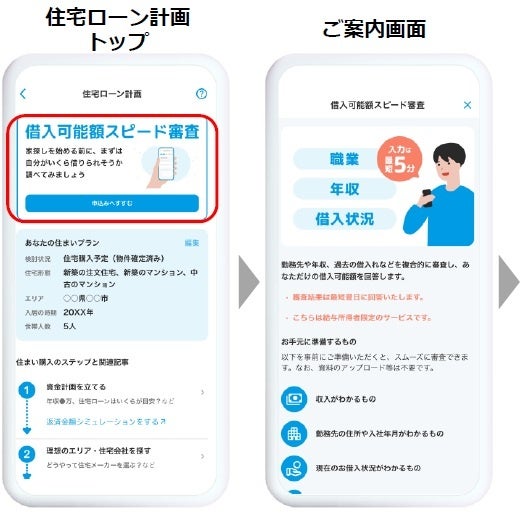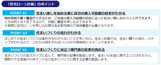 今回新たに提供する「住宅ローン計画」では、全国保証株式会社(代表取締役社長 青木 裕一)と連携し、 購入物件が決まっていない状態でもご自身の年収や借入状況などから、借入可能額の目安がわかる「借入可能額スピード審査」を提供するほか、住まいづくりや住まいづくりにかかるお金に関する専門記事を配信するなど、住まいづくりに関する不安を解消するための機能を搭載しています。