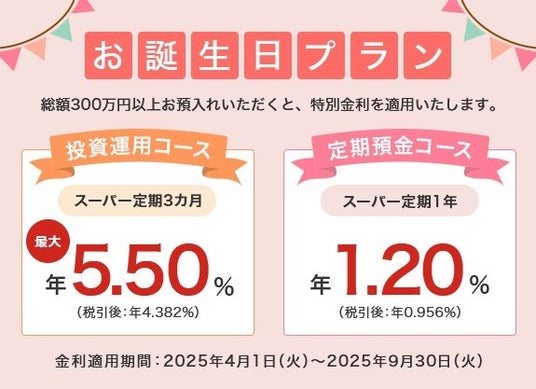 三井住友信託銀行株式会社(取締役社長:大山 一也、以下「当社」)は、2025年4月1日からトータルソリューションパック※1のお誕生日プランを改定し、定期預金コース「スーパー定期3カ月」の金利を年1.20%(税引後0.956%)に引き上げ、さらに投資運用コースを新設いたしました。1年に1度の特別な日に、特別金利をぜひご利用ください。