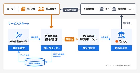 「AI与信審査モデル」は、事業者(以下、ユーザー)が『Mikatano 資金管理』に連携した口座情報をもとに、オリコの「信用保証付き融資」の貸付条件を自動で提示します。ユーザーは提示された条件を参考に、『Mikatano 融資ポータル』を通じていつでも融資の申し込み手続きが可能になります。金融機関は、オリコの保証により貸し倒れリスクなくオンラインレンディングの仕組みを事業者に提供できます。さらに「AI与信審査モデル」が提示した貸付条件を活用することで審査のプロセスを効率化できるため、融資実行までの期間を短縮できます。これにより、金融機関の業務効率化と、ユーザーの資金繰りの双方の課題解決を支援します。