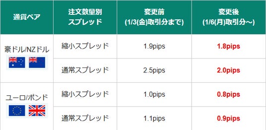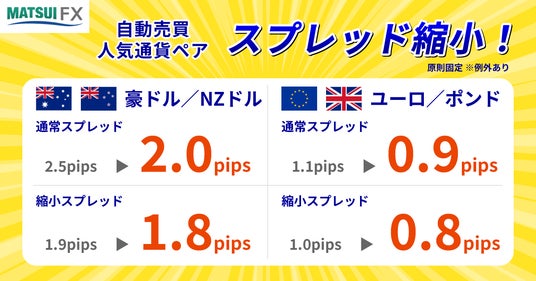 松井証券(本社:東京都千代田区 代表取締役社長:和里田 聰 以下「当社」)は、2025年1月6日(月)取引分(予定)より、FX サービス(外国為替証拠金取引)において、「豪ドル/NZドル」・「ユーロ/ポンド」のスプレッドを縮小いたします。なお、当社では、今回の2通貨ペアを含む全22通貨ペアにおいて、業界最狭水準*1のスプレッドを提供しております。