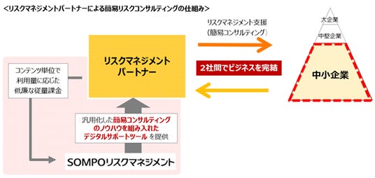 SOMPOグループでは、従来のSOMPOリスクによるオーダーメイド型のコンサルティングサービスのみでは普及に限りがあり、多くの中小企業へ幅広く効率的に、安価なサービスを提供する手法を摸索していました。