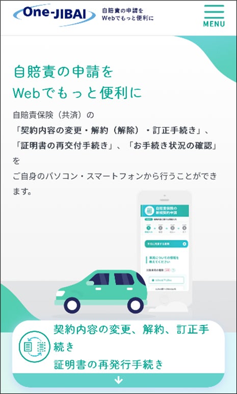 これまでの自賠責制度は「対面手続き」「現金での保険料・共済掛金(以下「保険料等」)払込」「自賠責証明書の紙交付」が前提でしたが、「One-JIBAI」の利用開始により、自賠責における非対面での手続きや保険料等払込のキャッシュレス化、自賠責証明書のPDFデータ交付を実現し、お客さまの利便性向上を図ります。
