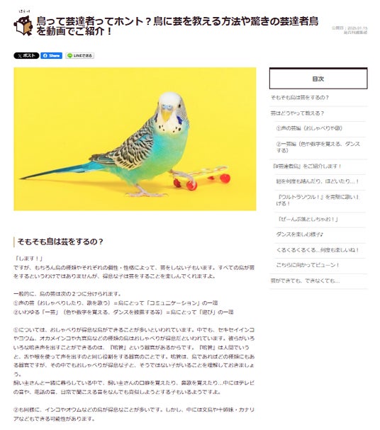 ペット保険シェアNo.1(※)のアニコム損害保険株式会社(本社:東京都新宿区、代表取締役 野田 真吾、以下 当社)は、鳥専門の情報サイト『鳥との暮らし大百科』をオープンしました。