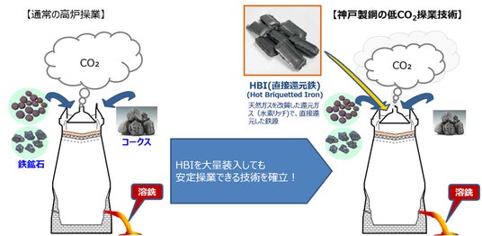 高炉でのCO2排出量の削減には、還元に使用するコークスの削減が有効であり、神戸製鋼は鉄鉱石の一部を既に還元済みの鉄鋼原料である「HBI(直接還元鉄)」に置き換えることで使用コークスを減らし、高炉でのCO2排出の約25%削減(従来技術比約2倍の削減量)に成功しました。“Kobenable(R) Steel”は、こうした高炉からのCO2排出量を大幅に削減できる技術を活用した低CO2製品です。