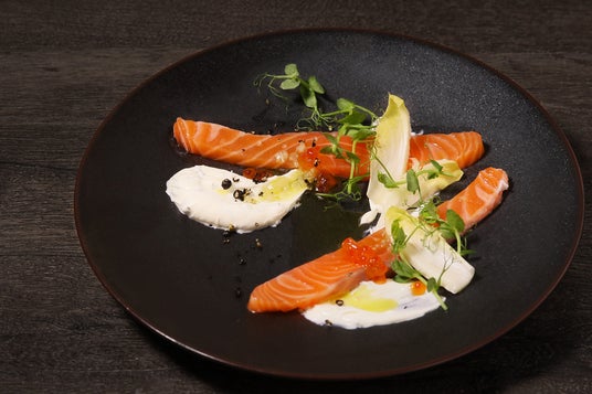 生サーモンに、ディル、イタリアンパセリ、セルフィーユとヨーグルトをブレンドしたソースを添えました。