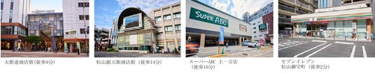 松山市随一の巨大アーケード商店街「大街道商店街」と、愛媛県内最初の屋根付きアーケード商店街「松山銀天街商店街」は、毎日多くの人で賑わっています。徒歩圏内にスーパーもあり、日々のお買い物にも便利な立地です。
