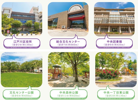 本物件はJR「新小岩」駅から、全長約420メートル・約140店舗の専門店が軒を連ねるルミエール商店街(徒歩13分)を抜け、江戸川区の行政の中心を担う江戸川区役所(徒歩2分)至近の地に誕生します。日常の買い物はもちろん、各種行政手続きまで徒歩圏内で済ませられます。また小松川境川親水公園(徒歩4分)、中央森林公園(徒歩11分)と自然の潤いも身近に感じられます。