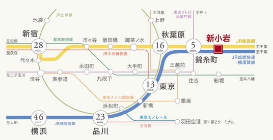 ※JR「新小岩」駅より「錦糸町」・「東京」・「品川」・「横浜」駅:JR総武線・横須賀線快速利用、「秋葉原」駅:JR中央・総武線各駅停車利用、「新宿」駅:JR中央・総武線各駅停車利用「御茶ノ水」駅でJR中央線快速に乗換え
