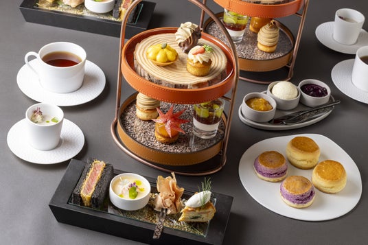 スイーツは、甘みの強い秋の野菜と、栗、シャインマスカット、林檎など秋を代表する果物を使用した2段構成で心ゆくまでご堪能いただけます。上段には、見た目も可愛らしい栗かぼちゃのタルトや、トリュフとポルチーニ茸のメレンゲマカロンなど、秋野菜を使用したスイーツをご用意。下段には、秋の代表的な果物を使用した、和栗のモンブランやシャインマスカットのヴェリーヌなどが並びます。