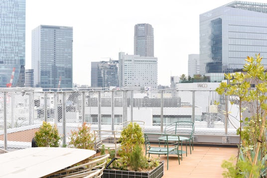 フレキシブルオフィス入居者が日常的かつ自由に利用可能なスペース。ラウンジは、全体またはエリアごとの貸切りにも対応しており、入居者は大人数での懇親会やイベントなどの用途で利用可能です。内部にはテキスタイルデザイナー安東陽子氏が製作したカーテンを設置し、日常的な演出およびエリアごとの仕切りにも活用いたします。テラスは、4階から屋上までつながる吹き抜け直下にあり、北谷公園にも視線が抜ける、開放感のある空間です。なお、ラウンジとテラスの間にある可動間仕切りを開くことで一体的に利用することが可能です。