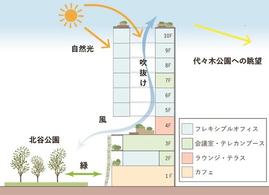 本物件は渋谷区内で初めてPark-PFI制度が活用された渋谷区立北谷公園(以下、北谷公園)の目の前に位置し、屋外空間や自然を感じられる環境と、多様化する働き方に対応する場所を提供します。「Work as you Please(好きに、働く。)」を開発コンセプトに、1名用から19名用まで多様な大きさの専有区画に加え、北谷公園や代々木公園を見渡すことのできる屋上、北谷公園を感じられるラウンジ、豊富なテレカンブース・会議室などの共用空間を設けています。