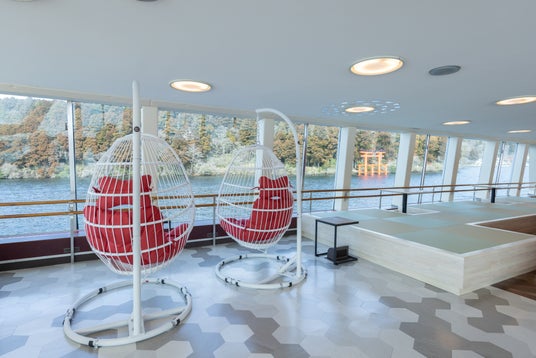 以前からある船体を継承しつつ、定員を大幅に減らし、生まれたゆとりにブランコ風ベンチや畳敷きの小上がりなど多彩な仕掛けをちりばめた空間は、湖上の公園という表現がふさわしい。天然の芝や蔦をデッキに使用したのは、環境基準に適応したためというが、視覚面でも優しさをもたらし、穏やかな気持ちにさせてくれる。時間と空間を贅沢に使える遊覧船の特性を存分に生かした、乗ることそれ自体がエンターテインメントになり得る移動体である。
