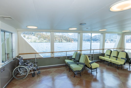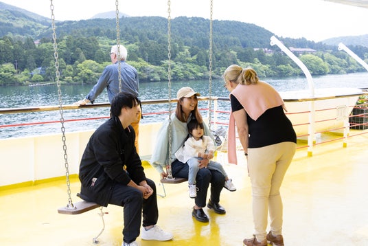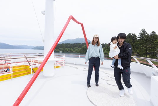 「あの席に座ってみたい!」と、思わず駆けていきたくなるユニークな席が揃います。また、赤富士をイメージしたソファ席をはじめ、テーブルの形状や天井のライト周りのミラーなど、いたるところに富士山モチーフがちりばめられ、散策しながら探すのもおすすめです。船内の椅子やテーブルにはふんだんに木材を使用し、木の質感を生かしたあたたかみのある居心地のよい空間が広がります。さらに伝統工芸である箱根寄木細工をモチーフにした床面、麻の葉をもとにした箱根寄木細工の文様「六角麻の葉」を装飾に取り入れるなど、箱根地域の特性を生かしたインテリアです。また、船内1階はバリアフリー対応化し、ベビーカー置き場や車いすスペース、多目的トイレも完備しています。すべてのお客さまに快適に過ごしていただけるよう、さまざまな面から「SDGs(持続可能な開発目標)」を意識しており、「子どもにやさしい」「いろいろな場所で景色を楽しめるのがよい」とのお声を数多くいただいています。
