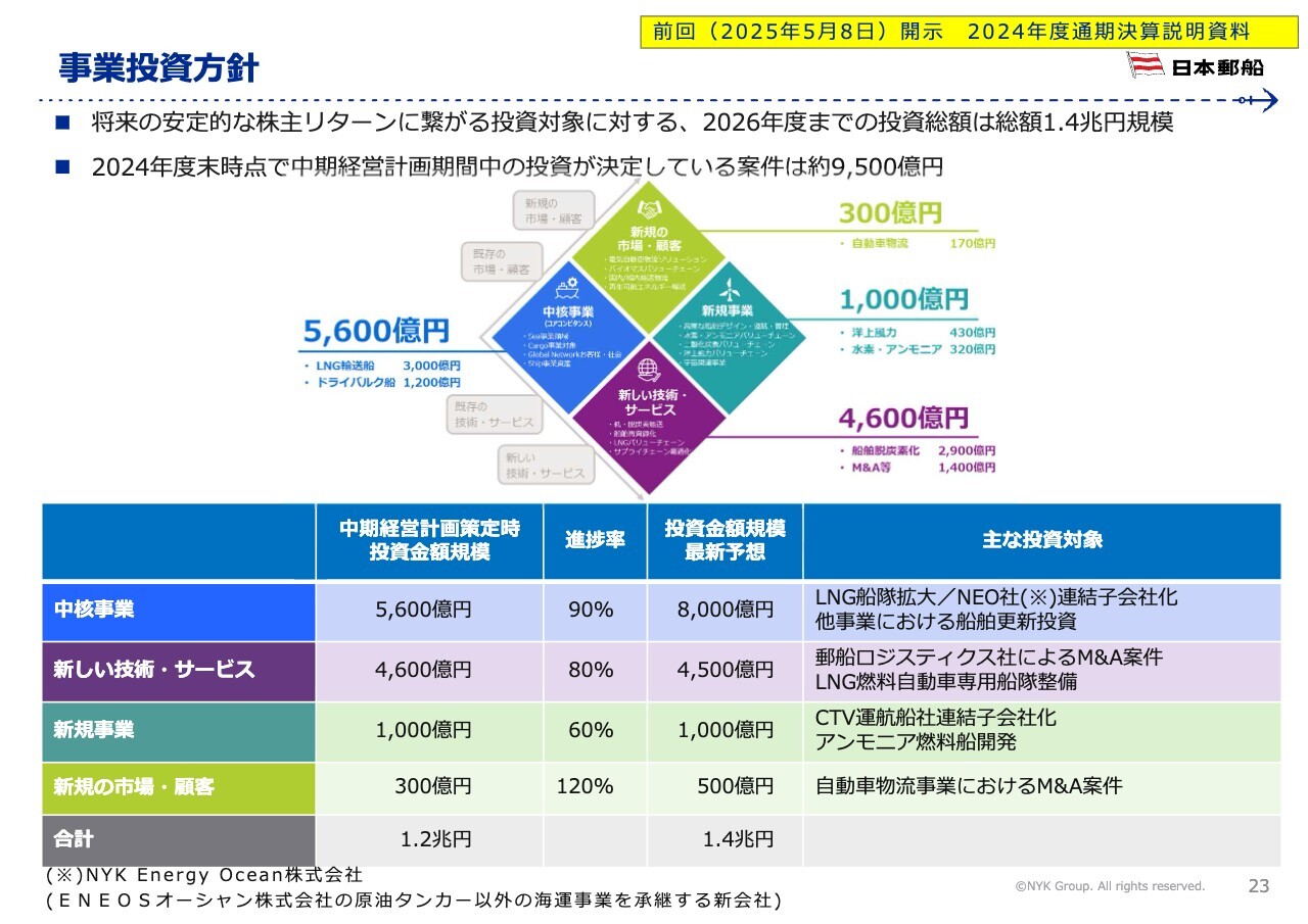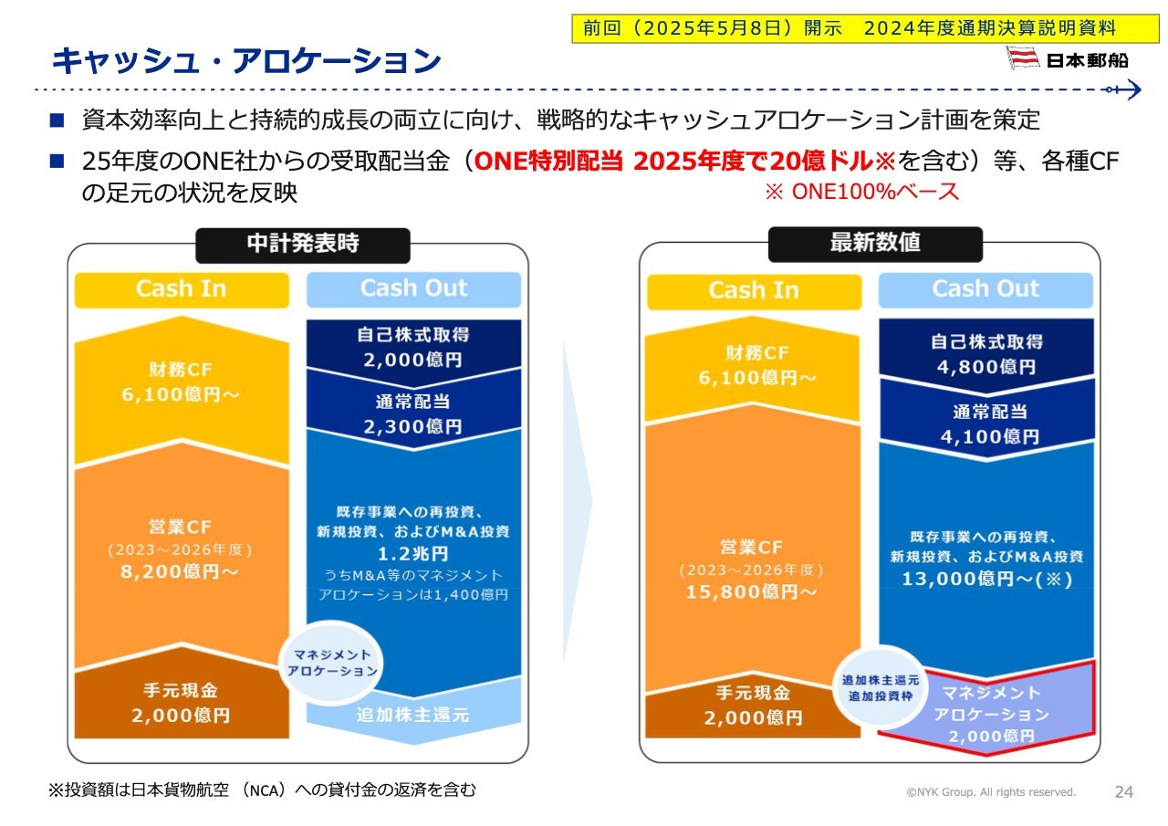 スライド24ページのキャッシュ・アロケーションでご説明すると、既存事業への再投資、新規投資、およびM&A投資が1兆3,000億円あります。一部は日本貨物航空への株式譲渡による戻り、一部は事業の売却等などがあり、実際は1兆4,000億円です。