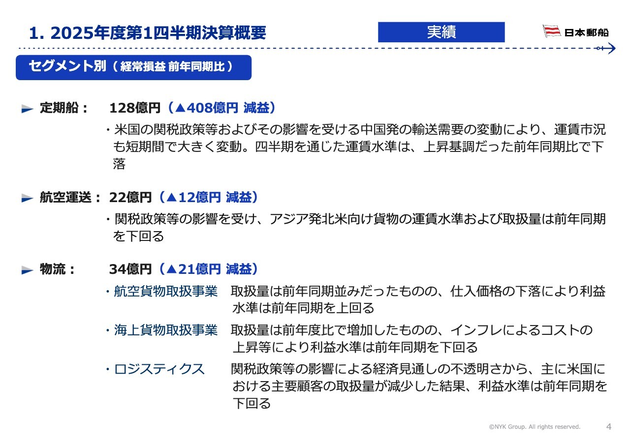 特に定期船事業では、船舶供給量の増加が継続する中、米国の関税政策やその影響を受けた中国発の輸送需要の変動によって、運賃市況が短期間で大きく変動しました。結果として、四半期を通じた運賃水準は前年同期比で下落したことから、減益となっています。