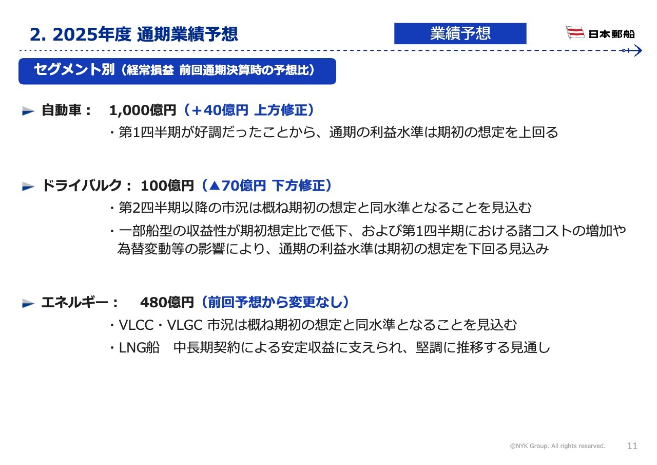 定期船事業の経常利益は、前回予想比110億円減益の700億円と予想しています。各国関税政策等の影響を織り込むとともに、期初に想定していた北米航路における夏場以降の短期運賃の上昇は見込まない予想としたことから、前回予想比では減益となる見通しです。