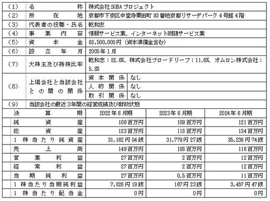 本件の実施により、発行済株式総数の100%を株式会社SOBAプロジェクトの既存株主から取得する予定で協議を進めております。株式取得について、乾和志氏以外の株式につきましては、株式譲渡契約書締結日までに同氏が取得する予定であります。株式取得の相手先につきましては、相手先の事業運営や取引交渉の円滑な遂行のため、現時点では相手先の詳細については非開示とさせていただきます。株式譲渡契約書締結後、速やかに開示いたします。本件株式の取得価額につきましては、当社直前期純資産の15%以上の金額となる予定です。なお、取得価額につきましては、独立した第三者機関の算定した評価額を基に株式取得の相手方と協議のうえ決定してまいります。