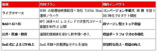 株式会社SOBAプロジェクトを迎え入れることで、売れるネット広告社グループは 「映像配信の特許技術」×「TikTok Shop運用ノウハウ」×「Web3・AI決済インフラ」 を一挙に内製化し、1.ライブコマースの最適化プロダクトを即時に商品化、2.NFT決済とパーソナライズAIを統合した“買う AI”時代の次世代コマース基盤を先行リリース、3.遠隔医療・オンライン教育・Web会議といった公共性の高い市場へ新規参入、4.コンサル主体のフロー収益にSaaSサブスクを重ねることでキャッシュフローをストック化--という四重のシナジーを同時に発揮できる体制が整います。