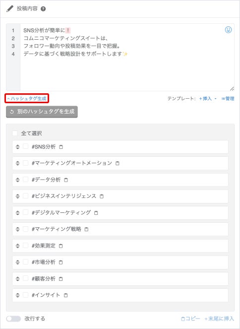 <AIによりハッシュタグを自動生成した後の、「コムニコ マーケティングスイート」の画面イメージ>