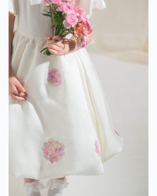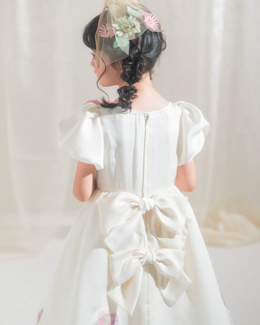 プリンセス感をアップグレードしたスペシャルな日本製のドレスです。しなやかでシルキーなサテン素材を使用し、オーガンジーに繊細な薔薇のブーケをプリントしたアップリケが目を引くポイント。後ろには大きなリボンを飾り、可愛らしいアクセントをプラスしています。バルーンシルエットでふんわりと軽やかな着心地なのも魅力。
