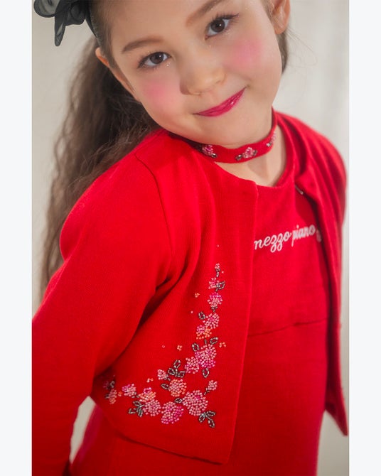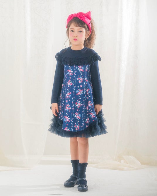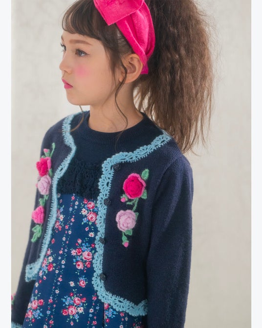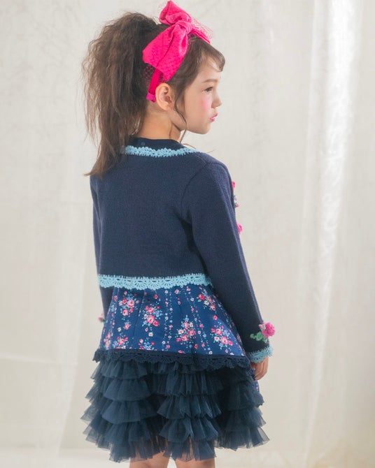 ワンピースとガーディガンのセット。レトロな壁紙調の花柄にニット素材を合わせたワンピースは、ヨークと裾にお揃いのニット糸のオリジナルレースをあしらいました。バックスタイルにはチュールのフリルを豪華に重ねキュートさをアピール。カーディガンは、ひとつひとつ職人が手で編み込んだ薔薇の立体モチーフをアクセントにしたスペシャルな逸品。