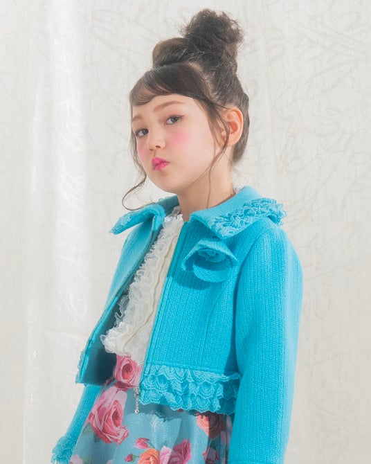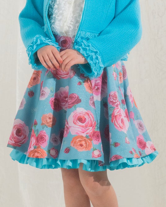 ジャケット、ブラウス、スカートの3点セット。オリジナルカラーのブルーグリーンはクチュール感に溢れ、ジャケットは襟と裾に繊細なレースのフリルとジップ明きでオシャレ感をプラス。シルキータッチの優しい素材のブラウスはチュールレースフリルでレトロエレガンステイストに。ラメ入りの素材にブランドの花、薔薇を手書きタッチにプリントしたフレアースカートは、裾にグログランリボンのフリルで華やかさをプラス。