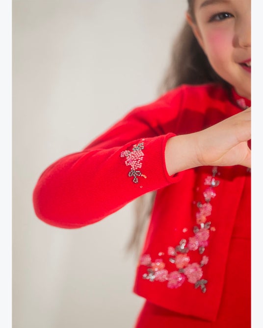 ニット生地に裏地付きの半袖ワンピースとボレロのセット。ビーズ刺繍のクラフトワークでアンティークテイストを取り入れ、お揃いのチョーカーでコーディネートにアクセントをプラス。ニットならではのやわらかい着心地。繊細なビーズ刺繍を、ワンピースとカーディガンにふんだんに散りばめた豪華なアイテム。
