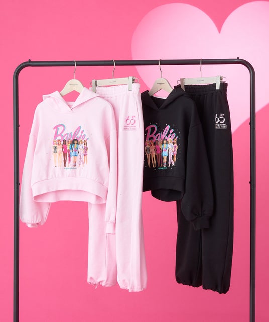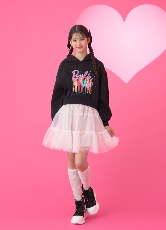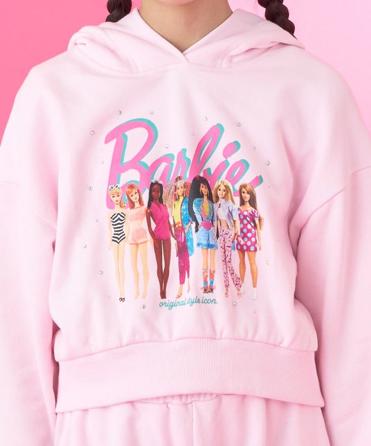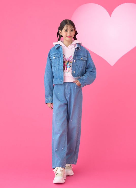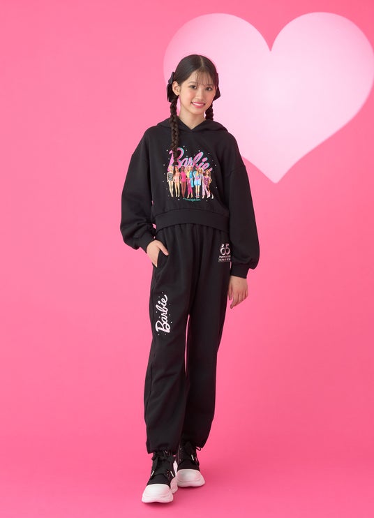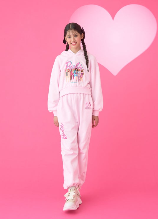 バービー誕生65周年を記念したアートを使用したアイキャッチなクロップドパーカと、ダンスや習い事にもぴったりなスウェットパンツが登場。ラメプリントやラインストーンが施され、華やかで元気な雰囲気に仕上がっています。デニムと合わせたレトロポップなスタイリングが、今季のトレンドにぴったりです。
