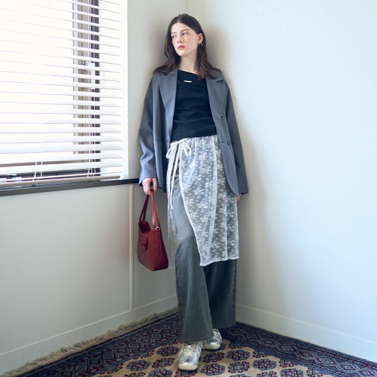 ルーズジャケット ¥7,590 ワンショルダートップス ¥3,850 デニムワイドパンツ ¥5,390 レース巻きスカート ¥2,530 (9/21発売) 2WAYショルダーバッグ ¥3,850