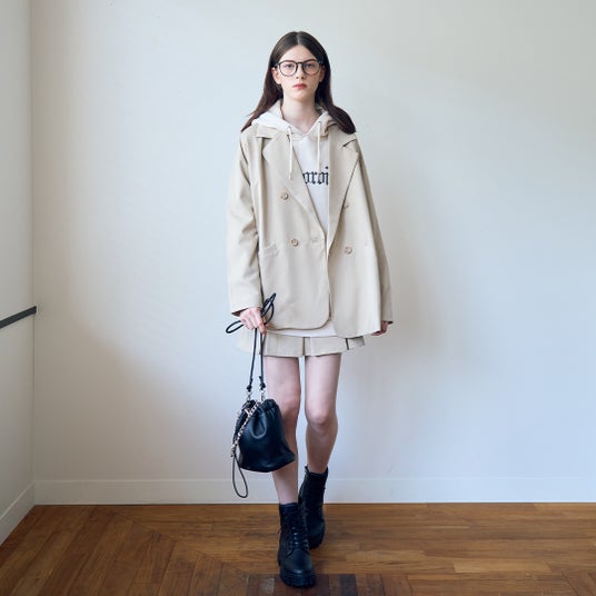 ルーズジャケット ¥7,590 ルーズフーディー ¥3,960 リボンプリーツスカート ¥4,290 2WAY巾着バッグ ¥3,300