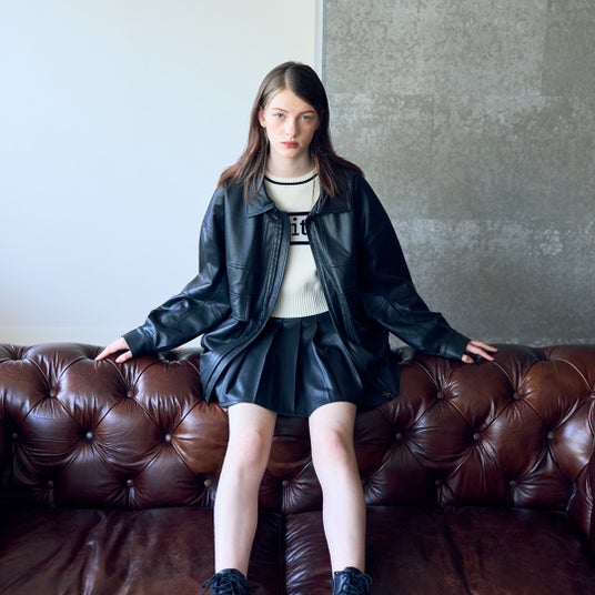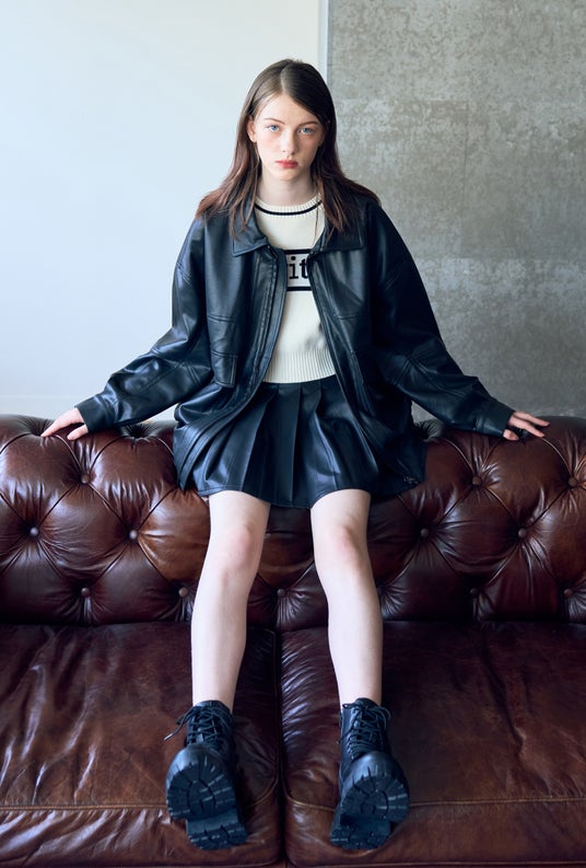 レザージャケット ¥8,690 ジャガードニット ¥4,290 プリーツスカート ¥5,390