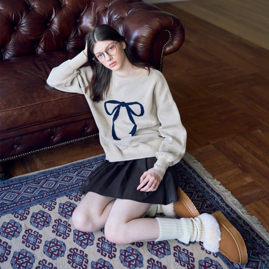 ジャガードニット ¥4,290 プリーツスカート ¥5,390 アンクルブーツ ¥3,960 レッグカバー ¥1,650