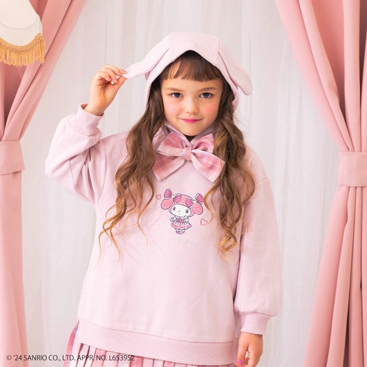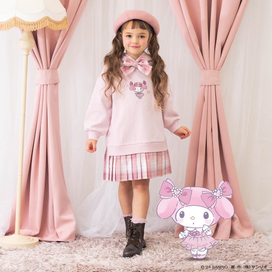 裾プリーツパーカワンピースオリジナルアートをアップリケ刺繍したパーカワンピース。マイメロディをイメージしたカラーのチェック柄のプリーツスカートをドッキングしたデザイン。フードにはマイメロディの耳が付いていて後ろ姿もフードをかぶってもかわいいデザイン♪