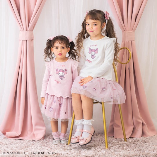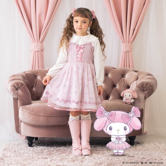 ブラウス&キャミワンピセットオリジナルのおめかし(ハート)マイメロディアートの総柄プリントを使用したワンピースとブラウスのセットは、チュールを重ねたスカートでふんわり広がるシルエットが女の子らしいポイント。