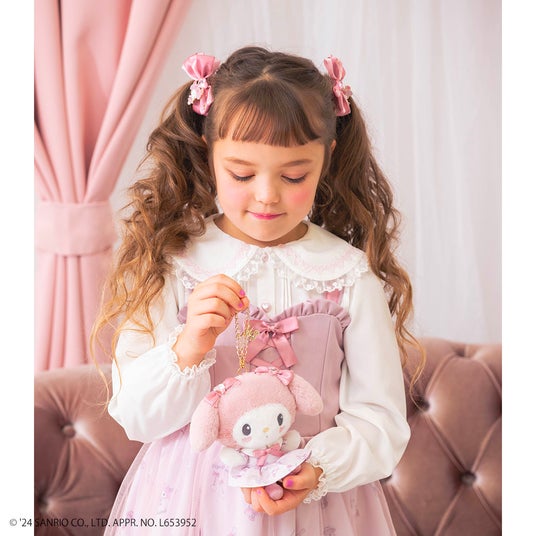 可愛すぎてきゅん(ハート)とする大人も使える小物オリジナルで描き起こした、「おめかし(ハート)マイメロディ」のアートをそのままぬいぐるみにしたキーチャームは、キャミワンピとお揃いデザインのお洋服を着せたので、マイメロディとリンクコーデが楽しめます。また、リボンのヘアポニーや、存在感のあるネックレスや、ショルダーバッグなど大人も使えるデザインで親子でお揃いもできる展開となっています。