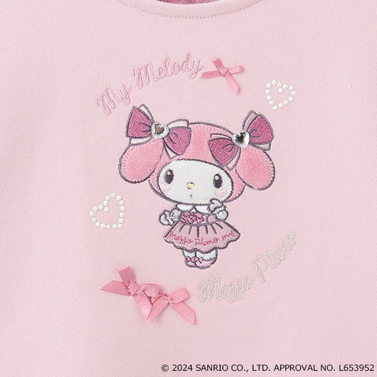 裾スカラップトレーナーオリジナルアートをアップリケ刺繍したトレーナー。マイメロディのぬいぐるみの様な触り心地の生地を使用したアップリケで、肩のチュールフリルは内側にハート柄のチュールを重ねているのがポイント♪