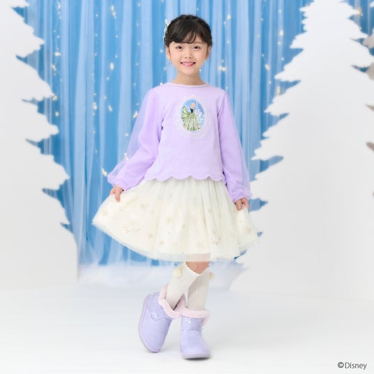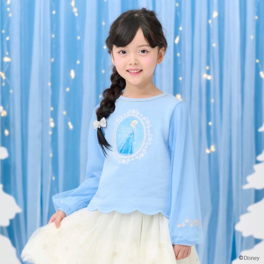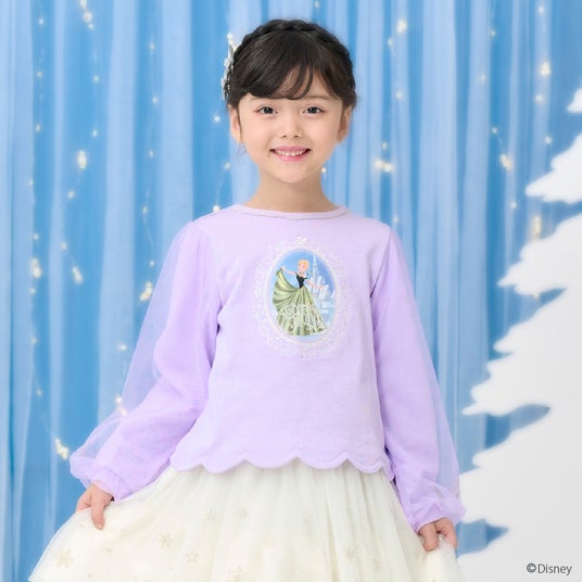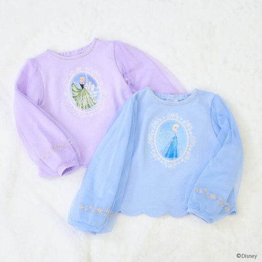 『アナと雪の女王』のデザインをあしらったトレーナーは、ライトブルーは「エルサ」、ラベンダーは「アナ」をデザインした二色展開!繊細な刺しゅうの周りにラインストーンを加えて、上品な雰囲気を演出しました。袖部分はチュールを重ねることで、プリンセスらしさをアップ(ハート)