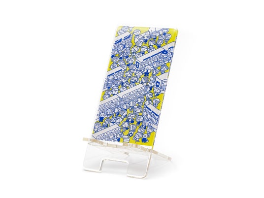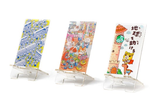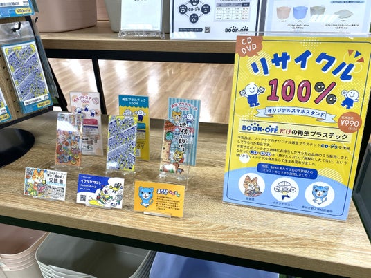 CDプラ商品の試作を積極的に取り組んでくださる株式会社エーワークスと共に、CDプラの透明度を生かしたスマホスタンドを製作。3名のイラストレーターとのコラボレーションで実現した、ブックオフ公式キャラクターのよむよむ君が描かれた3種の親しみのあるポップなデザインには、選ぶ楽しさでBOOKOFFでのお買い物を楽しんでいただきたい、リユース・リサイクルを身近に感じていただきたいという想いが込められています。