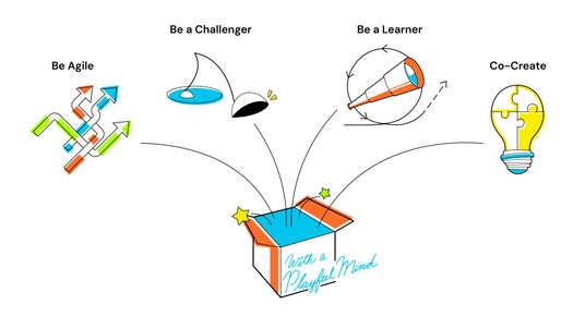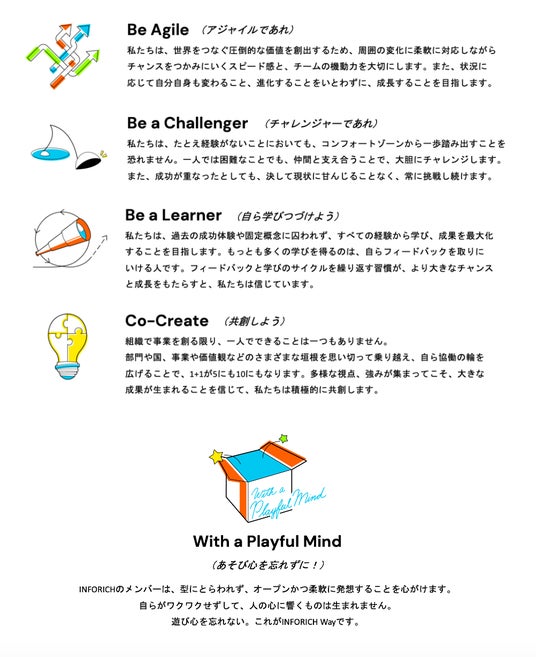 新たな四つのバリュー「Be Agile(アジャイルであれ)」「Be a Challenger(挑戦者であれ)」「Be a Learner(自ら学びつづけよう)」「Co-Create(共創しよう)」に加え、その根幹にあるマインドセットとして「With a Playful Mind(あそび心を忘れずに)」を組織の意思決定や行動の軸として、更なる飛躍を目指してまいります。