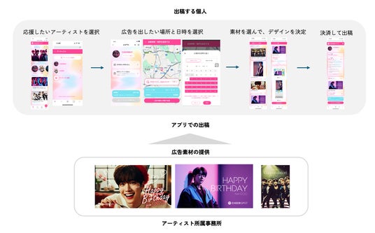 今回、新たに展開をする「CheerSPOT」は、デジタルサイネージを活用し、個人に数百円からの料金設定で広告枠提供を行うことで、新たなデジタルサイネージの活用方法を広げる取り組みとなります。素材は、アーティスト事務所が提供するため、権利上の問題もクリアになっており、安心してアーティストの応援が可能です。