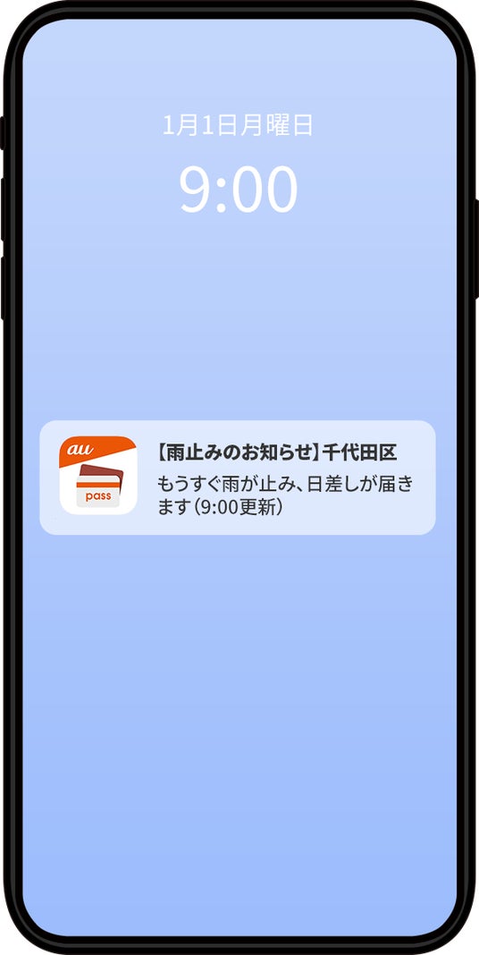 雨を予測する「雨雲アラーム」は既にありますが、雨が止むタイミングをお知らせするサービスは本機能が初めてです。今回、「日常のあったらいいなを形にしたい」というauスマートパスプレミアムの想いと、天気予報の精度向上に向けたウェザーニュースの継続的な取り組みにより、雨が止むタイミングをより正確に予測することが可能になりました。「雨が止んで天気が回復するパターン」「雨が止んで段々と天気が回復するパターン」「雲は残るけど雨は止むパターン」の3段階に分けたメッセージで、雨が止むタイミングをお知らせします。 「雨止みプッシュ」は、リアルタイムでの通知で雨の日の不便を、お客さまの計画的な行動をサポートします。