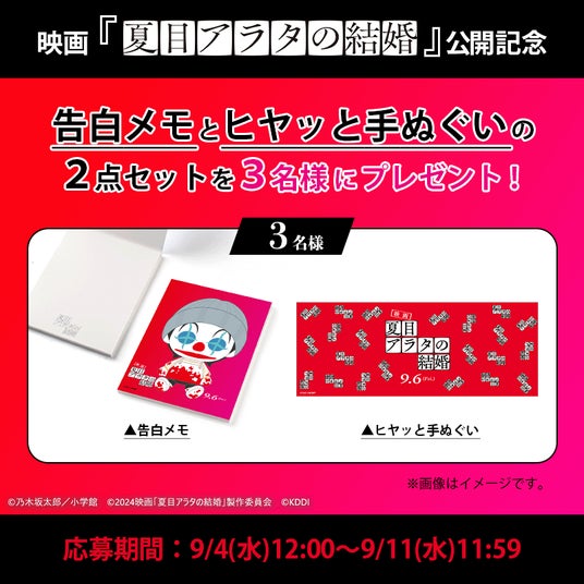 さらに、映画『夏目アラタの結婚』のオリジナル「手ぬぐい&メモ帳セット」があたるキャンペーンを実施中です。